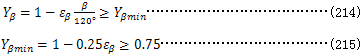 螺旋角系數(shù)Yβ是考慮螺旋角造成的接觸線傾斜對齒根應(yīng)力產(chǎn)生影響的系數(shù)。其數(shù)值可由式(214)和(215)計(jì)算。