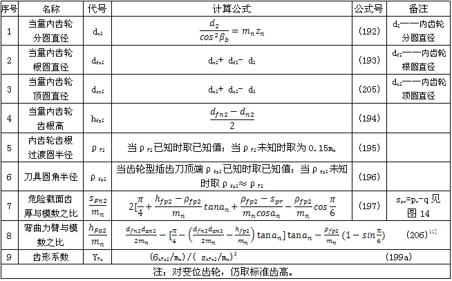 內(nèi)齒輪的齒形系數(shù)YF不僅與齒數(shù)和變位系數(shù)有關(guān),且與插齒刀的參數(shù)有關(guān)。為了簡化計(jì)算,可近似地按替代齒條計(jì)算(見圖15)。替代齒條的法向齒廓與基本齒條相似,齒高與內(nèi)齒輪相同,法向載荷作用角aFen等于an,并以腳標(biāo)2表示內(nèi)齒輪,有關(guān)計(jì)算公式見表20(適用于z2>70)。