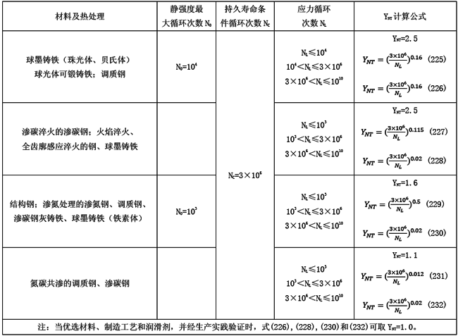 彎曲強(qiáng)度和壽命系數(shù)YNT應(yīng)根據(jù)實際齒輪實驗或經(jīng)驗統(tǒng)計數(shù)據(jù)得出的S-N曲線求得,它與材料、熱處理、載荷平穩(wěn)程度、輪齒尺寸及殘余應(yīng)力有關(guān)。當(dāng)直接采用S-N曲線確定和S-N曲線實驗條件完全相同的齒輪壽命系數(shù)YNT時,應(yīng)取系數(shù)YδrelT,YRrelT,Yx的值為1.0。