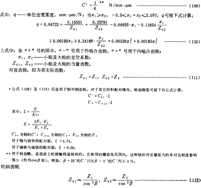 當(dāng)齒圈及輪輻很薄時,C′可較剛性齒輪降低50%。在端面重合度εα>1.2時,可近似取單對齒嚙合區(qū)上界點處的C′作為最大剛度,也可將公式(109)的計算結(jié)果約降低10%使用。