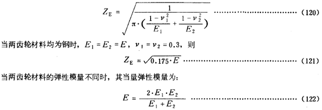 彈性系數ZE是用以考慮材料彈性模量E泊桑比v對赫茲應力的影響。其數值可按實際的材料彈性模量E和泊桑比v由式(120)計算得出。對于某些常用材料組合的ZE可參考表14查取。