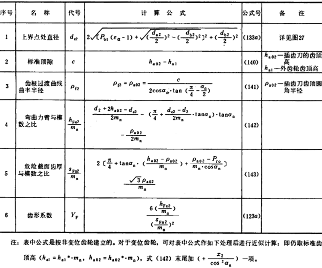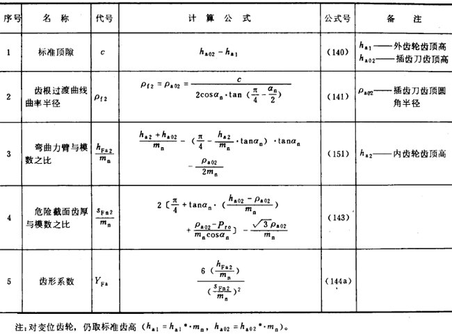 內齒輪的齒形系數YF不僅與齒數和變位系數有關,且與插齒刀的參數有關。為了簡化計算,可近似按替代齒條計算(見圖27)。替代齒條的法向齒廓與基本齒條相假,齒高與內齒輪相同,法向載荷作用角αFen等于αn,并以腳標2表示內齒輪。有關計算公式見表16(適用于Z2>70)。