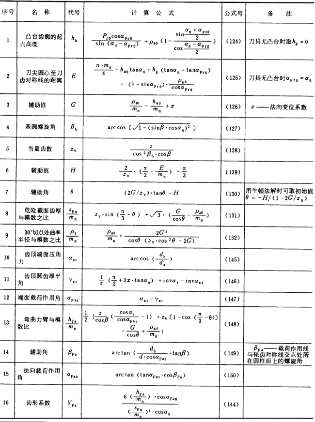 表16內齒輪齒形系數YF的有關公式