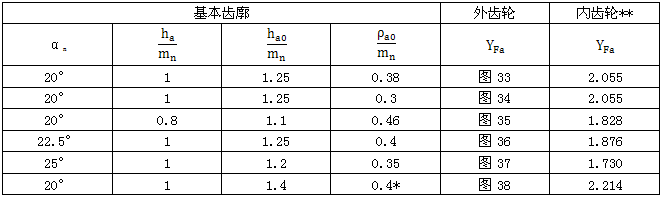 與圖33至38各齒形參數相對應的內齒輪齒形系數YFa也可由表19查取。