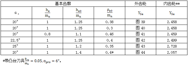 與圖39至44各齒形參數相應的內齒輪應力修正系YSa也可由表20查取。