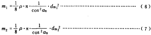 在設(shè)計(jì)階級(jí),精確確定小、大錐齒輪的當(dāng)量質(zhì)量m1及m2是困難的。對(duì)常見的錐齒輪結(jié)構(gòu)?山频匾詣(dòng)力當(dāng)量圓柱齒輪(見圖2)質(zhì)量來(lái)代替。于是,m1和m2可按公式(6)、(7)計(jì)算。
