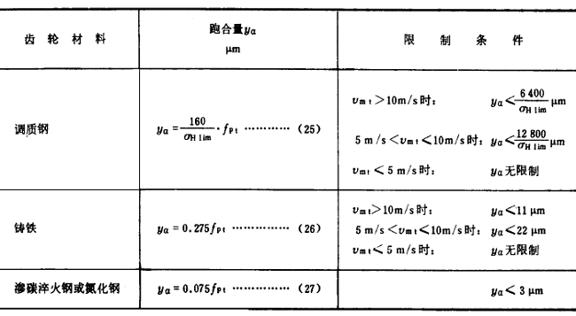 跑合量yα定義為通過(guò)跑合使運(yùn)轉(zhuǎn)之初的嚙合齒距誤差減小的量。如無(wú)實(shí)測(cè)數(shù)據(jù)時(shí),可由表7各式計(jì)算或由圖3、圖4查取。