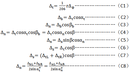 C2齒輪各項誤差應按下述規(guī)定的方向計值:Δfpb、ΔFb、ΔFpX、Δffβ、ΔFw、ΔEwm、jn在齒面法線方向計值;ΔFi′、Δfi′、ΔFp、ΔFpk、Δfpt、ΔFβ、ΔFic′、Δfic′、jt在分度圓切線方向計值;Δff在基圓切線方向計值;ΔFr、ΔFi″、Δfi″、ΔEα″和ΔEH在雙側(cè)齒面徑向計值;ΔEs在雙側(cè)齒面分度圓螺旋線的法線方向計值。