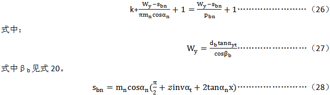 度量表面間所跨的齒數(shù)k應(yīng)這樣來選擇,即其接觸線大體上位于齒高的中間,可按下面方法來計算(圓整到最近的整數(shù)):