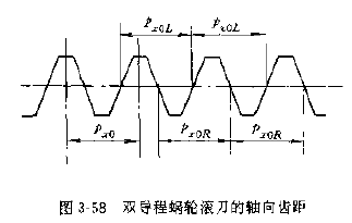 雙導(dǎo)程蝸輪滾刀有三種齒距;理論齒距pxo左側(cè)面齒距pxol和右側(cè)齒面齒距pxor,見圖3-58。滾刀全長上各個刀齒的齒厚由一端向另一端逐漸增大,其中有一個刀齒的齒厚等于標準值,稱此刀齒為標準齒,通過標準齒中線的截面,稱為標準截面見圖3-59。標準齒和標準截面是制造滾刀時控制齒厚的依據(jù),也是加工蝸輪時的對刀基準。