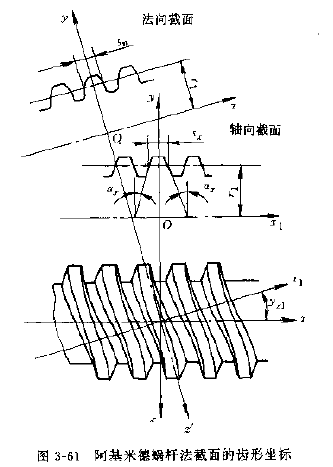 阿基米德蝸桿的法向截形方程,可按圖3-61所示的坐標(biāo)關(guān)系,由阿基米德螺旋面的基本方程轉(zhuǎn)換求得。