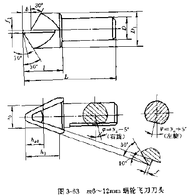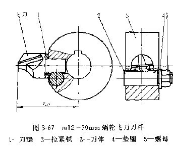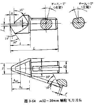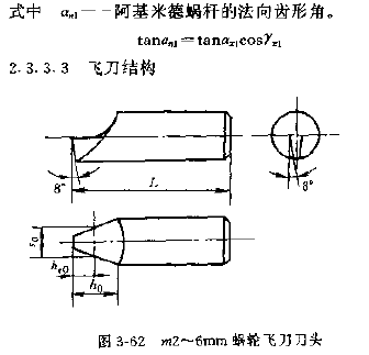 1.刀頭,飛刀刀頭一般作成圓柄狀,其前刃面通過柄部圓柱的軸線,根據(jù)被加工蝸輪模數(shù)的大小,刀頭一般分為三種,模數(shù)2~6、6~12、12~30的份刀圖3-62~圖3-64。后兩種飛刀頭由拉緊銷的斜面拉緊在飛刀刀桿上,飛刀刀柄平面與飛刀前面的夾角為 ,其值為: