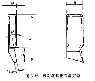成對(duì)滾切銑刀盤切齒時(shí),兩把銑刀盤在工件的同一齒槽內(nèi)工作,一把切削左齒面,另一把切削右齒面,切齒時(shí)有展成運(yùn)動(dòng),銑刀盤工作側(cè)刃與銑刀端面之間通常作出一個(gè)角,使產(chǎn)形輪的齒面成為一個(gè)凹錐面,因此切出的齒輪齒長方向呈中鼓形,有利于嚙合,根據(jù)使用機(jī)床的不同,銑刀盤的直徑有150。270及600mm,其中以直徑為600mm的銑刀盤應(yīng)用最廣。刀齒的凹入角δ有1°30′、2°30′和5°三種,常用的成對(duì)滾切銑刀盤刀齒的尺寸見圖3-76和表3-149~表3-151。