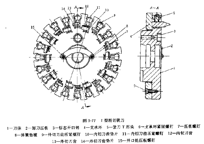 Ⅰ型雙面及三面粗切銑刀用于粗加工弧齒錐齒輪和準(zhǔn)雙曲面齒輪副中的大、小齒輪。該銑刀刀體硬度高、剛性好、刀齒采用T型塊夾緊,結(jié)構(gòu)緊湊,刀齒數(shù)量多,且裝卸靈活方便,銑刀有A、B兩中型式的錐孔直徑,A型孔適用于國(guó)產(chǎn)機(jī)床,B型孔適用于進(jìn)口格里森機(jī)床或新型仿制機(jī)床。銑刀公稱(chēng)直徑有3.75,4.5,5,6,7,5,9,10.5,12,14,16,18in等十一種,其結(jié)構(gòu)型式和基本尺寸見(jiàn)圖3-77和表3-152~153。