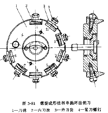 螺旋成形法和單循環(huán)法雙面精切銑刀實(shí)質(zhì)上是一種圓拉刀盤,它有軸向和徑向齒升量,這種刀盤有8個(gè)刀齒,4個(gè)外切刀齒,4個(gè)內(nèi)切刀齒,并有相當(dāng)于2個(gè)刀齒的空位,以便在齒過程中進(jìn)行分齒,螺旋成形法和單循環(huán)法有所不同,這兩種切齒方法都沒有滾切運(yùn)動(dòng),都是成形法,適用于弧齒錐齒輪和準(zhǔn)雙曲面齒輪副中大齒輪的精加工,這時(shí),與取配對(duì)的小齒輪都是用滾切法加工的,這兩種銑刀只能用在進(jìn)口格里森機(jī)床上,其公稱直徑有5,6,7.5,9,12in等,結(jié)構(gòu)型式和基本尺寸見圖3-81和表3-167~表3-168。