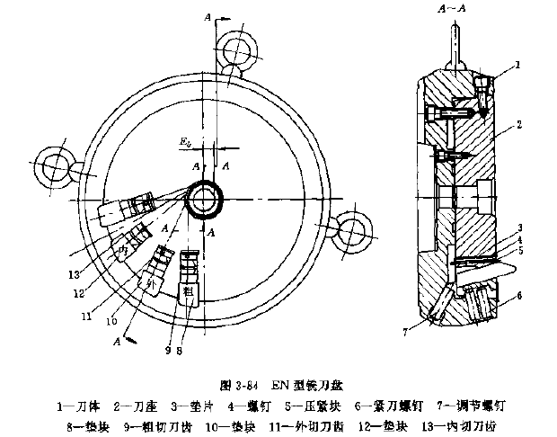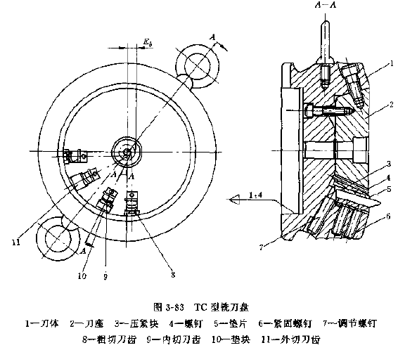 標(biāo)準(zhǔn)刀盤適用于成批和大量生產(chǎn)。較舊的標(biāo)準(zhǔn)刀盤是TC型刀盤,其公稱切線半徑39~125mm,用來(lái)切削法向摩樹2.1~8.5mm、外錐距55~250mm。當(dāng)量齒數(shù)24~75的普通延伸外擺線齒錐齒輪和小偏位的準(zhǔn)雙曲面齒輪。著種刀盤的結(jié)構(gòu)型式見(jiàn)圖3-83。TC型銑刀盤有不少缺點(diǎn),已被結(jié)構(gòu)較新的EN型銑刀盤和其他刀盤所代替。