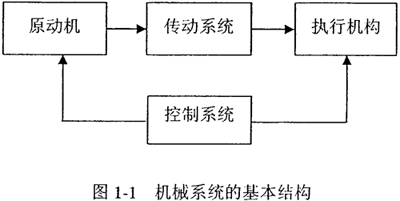 一般而言,機械是由原動機與若干機構(gòu)組合而成的系統(tǒng),稱為“機械系統(tǒng)”。按照各組成環(huán)節(jié)的功能劃分,機械系統(tǒng)的基本結(jié)構(gòu)如圖1-1所示。