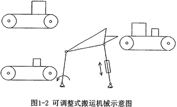 圖1-2所示是一種可調(diào)整曲柄搖桿機構(gòu)組成的搬運機械。其中,一個普通電機驅(qū)動曲柄等速回轉(zhuǎn),在搖桿上還安裝有一個控制電機。該機械的工作原理為:右邊的傳送帶上送來的箱子有大有小。要求將大箱子般到左上方的傳送帶上,而將小箱子般到左下方的傳送帶。恰當設(shè)計連桿機構(gòu)的尺度,并利用控制電機來調(diào)整搖桿的長度,可以分別完成上述任務(wù)。