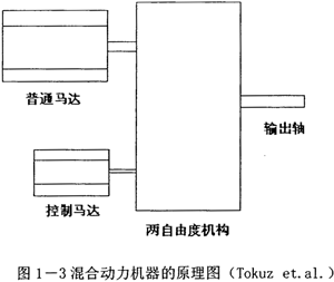 其基本原理如圖1-3所示,一個普通馬達和一個控制馬達分別驅(qū)動一個兩自由度機構(gòu)的兩個輸入構(gòu)件。設(shè)計者期望通過機械與馬達的恰當配合,使得普通馬達提供系統(tǒng)所需的主要功率,而控制馬達僅提供佼小的輔助功率,但還能夠?qū)敵鲞\動進行控制。混合動力機器的研究動機之一是期望以一個大功率(大扭矩)的普通馬達、一個小功率(小扭矩)的控制馬達、以及一個機構(gòu)的組合系統(tǒng)來替代一個大功率(大扭矩)的控制馬達,從而降低成本。混合動力機器的研究動機之二是期望利用機構(gòu)具有的高機械利益(與控制馬達和負載直接耦合的清形比較而言)來提高運動控制的精度及穩(wěn)定性。