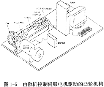 近年來,顏鴻森等人致力于有關(guān)變輸入轉(zhuǎn)速凸輪機構(gòu)的研究,其具體成果為通過仿真和試驗驗證消除了從動件的運動特性曲線的不連續(xù)性,及降低了各種凸輪曲線(如擺線、多項式曲線等)的從動件和加速度峰值。其實驗系統(tǒng)如圖1-5所示,其中微機控制的伺服電機作為變速單元,以直動滾子從動件平面凸輪機構(gòu)為執(zhí)行機構(gòu)。