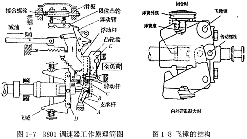 圖1-7為R801調(diào)速器的工作原理簡圖,圖1-8為飛錘結(jié)構(gòu)圖。該調(diào)速器采用特殊的凸輪機構(gòu)和浮動桿的可變杠桿比(1.1~5.4)進行調(diào)速,可獲得多種適應(yīng)特性。在調(diào)速器上部,裝有全負荷限位機構(gòu),用于確定限位凸輪的位置。調(diào)整全負荷限位機構(gòu),將使滑板左右移動。擰出或擰進接合螺栓,可調(diào)整限位凸輪上下移動偏轉(zhuǎn)一微小角度,以此改變限位凸輪型線方程。操縱手柄和轉(zhuǎn)動桿固定在操縱手柄軸上,轉(zhuǎn)動桿帶動導(dǎo)向軸,導(dǎo)向軸的一端沿凸輪盤中滑槽的型線作運動。其另一端帶有一滑塊,滑塊在圓柱形的浮動桿內(nèi)上下移動,以此實現(xiàn)可變杠桿比。如調(diào)節(jié)手柄轉(zhuǎn)到“怠速”位置時,浮動臂不與限位凸輪接觸,此時限位凸輪不起作用。如果發(fā)動機轉(zhuǎn)速超過設(shè)定的轉(zhuǎn)速,則飛錘更張開,使滑動螺栓左移,B點繞A點逆時針轉(zhuǎn)動,同時浮動桿繞C點按順時針方向轉(zhuǎn)動,拉引調(diào)節(jié)齒桿向“怠速”位置移動,而使發(fā)動機轉(zhuǎn)速下降。如果怠速時柴油機轉(zhuǎn)速下降,則會產(chǎn)生與上述相反的過程。