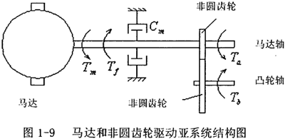 如圖1-9所示的馬達和非圓齒輪驅(qū)動系統(tǒng),如果沒有加設(shè)一對非圓齒輪,馬達提供給凸輪軸的是一個恒定的速度(理論上),加了非圓齒輪后,通過非圓齒輪節(jié)線的設(shè)計,為凸輪軸傳遞一個可變的速度輸入函數(shù),從而產(chǎn)生所要求的速度輸出函數(shù)。