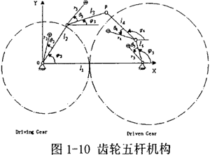 3.設(shè)計空問受約束于拓撲結(jié)構(gòu)與構(gòu)件的受力條件。例如,雖然四桿機構(gòu)最為簡單實用,但是仍有許多性能要求更高的場合不得不采用多桿機構(gòu)(如圖l-10所示的齒輪五桿機構(gòu),圖中圓齒輪分別與桿l2·l5固連)。