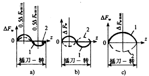 插齒時,有三個基本因素對產(chǎn)生△Fw值是有影響的,首先就是機床分度蝸輪副的運動誤差(運動偏心),由于分度蝸輪副運動偏心所產(chǎn)生的公法線長度變動量是正弦曲線時,每個分度蝸輪副的誤差相加后得出公法線長度的總誤差,其值不僅與分度蝸輪副的原始誤差有關(guān),而且與正弦曲線的相位移有關(guān),同時也與插齒刀與工件齒數(shù)間的比例關(guān)系有關(guān)。如果插齒刀與工件齒數(shù)相等或成整數(shù)倍的話,那么在正弦曲線方向相同的條件下,總誤差Fw將減小(圖1a)。當(dāng)正弦曲線方向不同時,根據(jù)不同的相位距Fw值或可能沒有變化 (圖1b)或達到最大值(圖1c)。因此可以說,甚至在插削相同工件時,也可能產(chǎn)生不同的原始誤差總值。