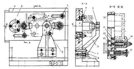 (2)夾具操作:將工件裝入兩定位銷(xiāo),擰緊鉤形壓板螺母,縱向移動(dòng)拖板使對(duì)定機(jī)構(gòu)15的圓柱銷(xiāo)插入到加工第一個(gè)孔的銷(xiāo)孔中。當(dāng)加工完第一個(gè)孔后,松開(kāi)兩個(gè)鎖緊螺母3,拔出對(duì)定機(jī)構(gòu)15的圓柱銷(xiāo),移動(dòng)分度塊2,使對(duì)定機(jī)構(gòu)15的圓柱銷(xiāo)插入到加工第二個(gè)孔的銷(xiāo)孔中,并擰緊螺母3,加工第二個(gè)孔。