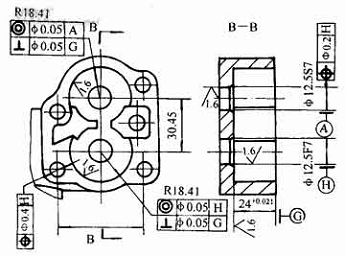圖1為齒輪泵體加工兩孔的工序簡(jiǎn)圖。從圖1可知:小孔12.5為7級(jí),且兩孔極限尺寸不同;大孔R(shí)18.41接近8級(jí);有同軸度、垂直度、位置度公差要求,特別是位置度公差很小。因此,孔的加工難度大。