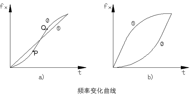 如a中的②圖所示,在頻率輸出過程中,頻率與時(shí)間的關(guān)系呈“S”形,即:在剛起動(dòng)時(shí),頻率的變化比較慢(0-P段),然后頻率又和時(shí)間成線性變化,在Q點(diǎn)以后,頻率的變化又降了下來。此種方式適合于帶式輸送機(jī)一類的負(fù)載。