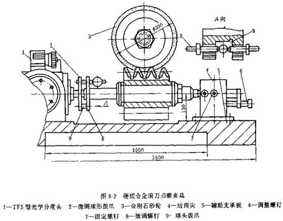 4.刃磨夾具,在M7130型機(jī)床上安裝如圖8-2所示的刃磨夾具,可刃磨模數(shù)為15~20mm的滾刀,在夾具中采用TF5型光學(xué)分度頭,其分度精度為10″,該夾具調(diào)試精度可達(dá)0.001mm,砂輪軸經(jīng)調(diào)整后,其端面圓跳動不大于3~5μm,徑向圓跳動不大于5~10μm。