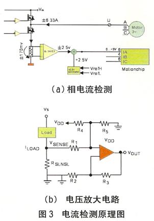 電流檢測 電機電流檢測電路可提供重要的反饋信息,將該信息與來自主控DSP的控制信號相結合,可以控制MOSFET或IGBT的柵極驅動芯片并最終調整電機速度。如果要實現過流保護,還必需進行電流監(jiān)控,不過對于低端應用而言,傳統(tǒng)的過流保護卻顯得過于昂貴。電流采樣的方案是在逆變橋的下橋臂串一0.027Ω采樣電阻如圖3(a),采樣電流范圍為0~6.22A,采樣后的電壓放大倍數為14.63倍,放大電路如圖3(b),并經2.5V電壓抬升輸入DSP,所以輸入DSP的電流模擬電壓量為: UAD=2.5+I×0.027×14.63。 MotionChip AD口的模擬量輸入電壓為0~5V,所以電流采樣經量化的值為: