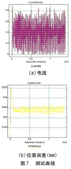 用戶操作界面功能有: •參數設置與顯示模塊主要是設置一些系統(tǒng)參數(如掃查長度,探測寬度)和控制參數(如速度參數、加速度參數等); •任何時刻,控制程序都時刻監(jiān)視系統(tǒng)的運行狀況,隨時對系統(tǒng)故障做出相應的處理。 軟件部分包括X向運動和Y向的掃查運動,數據存儲及處理,手動控制,故障處理,運動狀態(tài)顯示及故障顯示等。操作界面(GUI)給予清晰、簡單的用戶界面,方便用戶調試、運行,同時能夠將伺服驅動器傳遞過來的信息顯示出來,便于監(jiān)控。任務編程模塊將要實現控制任務的規(guī)劃,如X軸向和Y軸向運動等,包括故障查詢、處理。 運行效果 智能伺服驅動器性能的好壞直接決定整個系統(tǒng)設計的成敗,為此用一直流電機對驅動器進行測試,電機的電流和位置誤差如圖7(a)、(b)所示,從圖7中可以看出,驅動器的響應時間只有0.12s,位置誤差很小。通過對通訊速度及上位機控制命令的測試顯示,在實時性要求不是非常嚴格的情況下,以RS232串口或者485串口的通訊速率是完全可以滿足系統(tǒng)需求的。