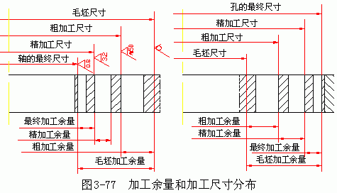 加工總余量也是個(gè)變動(dòng)值,其值及公差一般可從有關(guān)手冊(cè)中查得或憑經(jīng)驗(yàn)確定。如圖 3-77 表示了內(nèi)孔和外圓表面經(jīng)多次加工時(shí),加工總余量、工序余量與加工尺寸的分布圖。