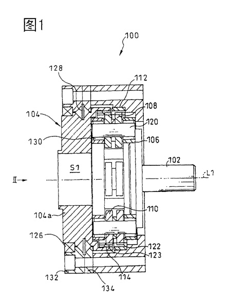 一種減速機,其備有:輸入軸、將該輸入軸的旋轉減速的減速機構部,以及將利用該減速機構部減速的旋轉輸出到相應機械側的輸出軸,其特征為, 在將前述輸出軸制成中空的同時,將前述輸入軸和輸出軸分別同軸地配置,利用配備有連接到前述輸入軸上的托架,以相同的旋轉速度可旋轉地支承在該托架上的第一、第二行星齒輪,與前述第一行星齒輪嚙合、并保持固定狀態(tài)的第一內齒齒輪,與前述第二行星齒輪嚙合、并連接到前述輸出軸上的第二內齒齒輪的行星齒輪機構構成前述減速機構部,并且, 在前述第一、第二行星齒輪中,至少將一個行星齒輪的齒形制成次擺線的齒形,同時,將與該次擺線齒形的行星齒輪嚙合的齒輪制成圓弧齒形。
