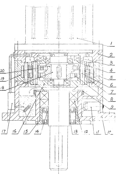 | 一種釜用不泄漏減速機,由擺線輪[8]、輸入軸[18]、偏心軸承[20]、機座[10]、針齒輪及W輸出機構組成,其中針齒輪由針齒殼[19],均布在針齒殼上的針齒[7]構成,W機構由輸出軸[16]與均布在輸出軸圓盤上的柱銷[6]及柱套[5]構成,其特征在于: a)機座[10]內有一儲油腔,機座外壁有一油泵[17]用來將儲油腔的潤滑油泵至減速機頂端由上而下對機件進行潤滑; b)在輸出軸支承軸承[12]頂端有一圓環(huán)蓋[9],其高度高于儲油面1~3cm,用以防止從沿輸出軸漏油; c)在輸出軸軸承[12]下端有一個密封組件,它由套筒[15]及裝在套筒內的密封[13]、[14]構成,二密封之間要有一定空間,密封組件用以防止有毒介質從反應釜中泄漏到減速機內腔。 |