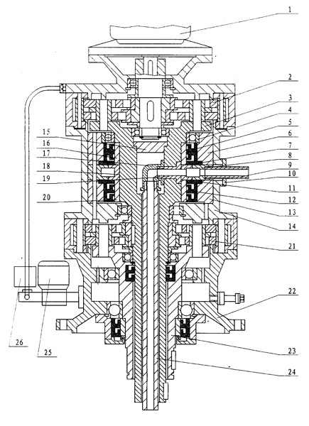 一種雙出軸噴液擺線減速機(jī),其主要特征是在中間法蘭(14)中設(shè)有輸入接管(9),該輸入接管(9)與液體外套(8)聯(lián)接并通過(guò)管接頭(19)橫向進(jìn)入中空的中間輸出軸(3)內(nèi),所述中空的中間輸出軸(3)與管彎頭(17)聯(lián)結(jié)后再與液體輸出管(24)接通。本實(shí)用新型應(yīng)用在食品、飼料、化工等工業(yè)的雙螺旋、單螺旋混合機(jī)上,與現(xiàn)有的蝸輪,傘齒輪噴液減速機(jī)相比,重量減輕20~35%,壽命約增加60%,而且有效地降低了溫升和噪音。