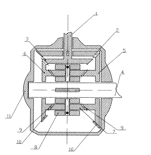 | 本發(fā)明涉及機(jī)械傳動(dòng)裝置,具體地說是以非等速運(yùn)動(dòng)的速度差完成力的傳遞,并具有大傳動(dòng)比的速差減速機(jī)。速差減速機(jī)設(shè)有相互垂直設(shè)置的主動(dòng)軸(1)和從動(dòng)軸(4)、第1主動(dòng)錐齒(2)和第2主動(dòng)錐齒(3),從動(dòng)軸(4)上滑動(dòng)套大雙錐齒滑動(dòng)齒輪(5)和小雙錐齒滑動(dòng)齒輪(6),大雙錐齒滑動(dòng)齒輪(5)和小雙錐齒滑動(dòng)的內(nèi)齒圈(9)之間設(shè)有行星齒輪(7)同時(shí)與兩側(cè)內(nèi)齒圈(9)嚙合,所述行星齒輪輪輻(8)與從動(dòng)軸(4)傳動(dòng)連接。由于兩個(gè)雙錐齒滑動(dòng)齒輪因不同徑而產(chǎn)生速度差,因而行星齒輪(7)同時(shí)受兩個(gè)雙錐齒滑動(dòng)齒輪異向驅(qū)動(dòng)力和速差平衡驅(qū)動(dòng)力的作用。通過調(diào)節(jié)兩個(gè)雙錐齒滑動(dòng)齒輪的直徑差,就可以得到所需的傳動(dòng)比,傳動(dòng)比可達(dá)數(shù)千至數(shù)萬。另外速差減速機(jī)的結(jié)構(gòu)非常簡(jiǎn)潔、緊湊,因此,體積相對(duì)較小。 |