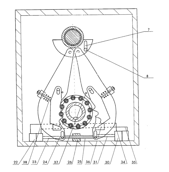 | 一種減速機(jī),其特征是輸入軸是偏心軸(2),偏心軸(2)中間偏心外圓上設(shè)置3-12個(gè)外套(32),每個(gè)外套(32)上分別連接連桿(27)位于殼體(1)內(nèi)一側(cè),每個(gè)連桿(27)連接能與滾輪(13)邊緣上的滾子輪(10)嚙合的鉤齒板(16);在工作時(shí)至少有1個(gè)鉤齒板(16)和對(duì)應(yīng)滾輪(13)邊緣上的滾子輪(10)嚙合,每個(gè)滾輪(13)邊緣上裝有5-80個(gè)滾子輪(10),上述所述的連桿(27)上裝有與滾輪(13)邊緣上的滾子輪(10)嚙合的鉤齒板(16)與對(duì)應(yīng)的3-12個(gè)滾輪(13)分別固定在輸出軸(12)上,且兩個(gè)相鄰滾輪邊緣上的滾子輪(10)在橫向排列上相位差是一個(gè)等值弧度,在連桿(27)上設(shè)置有定位槽(24),固定銷(21)設(shè)置在連桿(27)定位槽(24)內(nèi)位于殼體(1)內(nèi),鉤齒板(16)背面設(shè)置有彈性復(fù)位裝置。 |