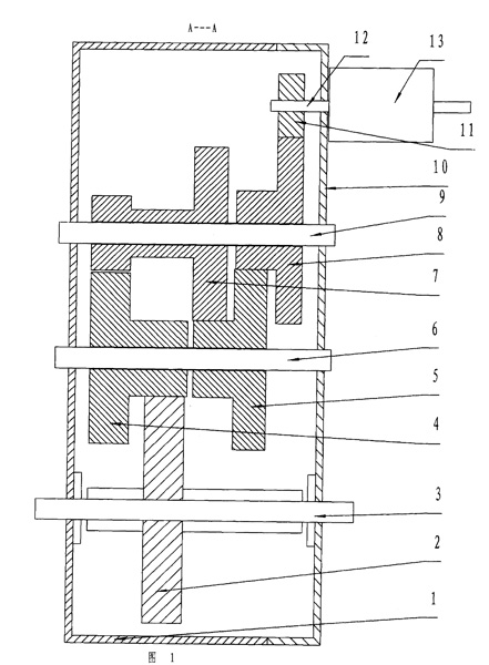 | 一種雙軸四減速減速機(jī),包括外殼體、外殼蓋、輸入軸、輸出軸、齒輪,其特征在于:外殼體上裝有平行的一軸、二軸、動(dòng)力輸出軸,一軸上裝有一軸齒輪組甲和一軸齒輪組乙、兩組中至少有一組可以繞軸自由轉(zhuǎn)動(dòng),二軸上裝有二軸齒輪組甲和二軸齒輪組乙、兩組中至少有一組可以繞軸自由轉(zhuǎn)動(dòng),動(dòng)力輸出軸上固定著輸出軸齒輪,外殼蓋上固定著輸入軸軸承座,輸入軸上固定著輸入軸齒輪,各齒輪組分別由大直徑齒數(shù)多的齒輪和小直徑齒數(shù)少的齒輪組成,輸入軸齒輪與一軸齒輪組甲的大直徑齒輪嚙合,一軸齒輪組甲的小直徑齒輪與二軸齒輪組甲的大直徑齒輪嚙合,二軸齒輪組甲的小直徑齒輪與一軸齒輪組乙的大直徑齒輪嚙合,一軸齒輪組乙的小直徑齒輪與二軸齒輪組乙的大直徑齒輪嚙合,二軸齒輪組乙的小直徑齒輪與輸出軸齒輪嚙合。 |