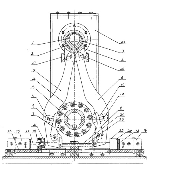 | 一種換向減速機(jī)包括殼體,換向裝置,主動(dòng)輪,被動(dòng)輪,輸出軸,輸入軸,其特征在上述所述的輸入軸(1)上固定偏心輪(2),偏心輪(2)外圓上有偏心軸承(3),偏心輪軸承(3)外圓上有拉板套(4),拉板套(4)上分別鉸連左拉板(5)、右拉板(6);左拉板(5)上鉸連左拉鉤(7),左拉鉤(7)上固定左拉鉤導(dǎo)塊(9);用左拉鉤導(dǎo)塊銷(xiāo)(11)與左拉板(5)鉸連;在右拉板(6)上鉸連右拉鉤(8),右拉鉤(8)上固定右拉鉤導(dǎo)塊(10)用右拉鉤導(dǎo)塊銷(xiāo)(12)與右拉板(6)鉸連,在輸出軸(13)上固定套筒滾子輪(14),在底板(26)上固定左程控液力缸(15)、右程控液力缸(16),左拉板導(dǎo)板(21),右拉板導(dǎo)板(22);在左程控液力缸(15)內(nèi)裝左柱塞(17),用左拉板鎖定器(19)與左拉板導(dǎo)板(21)連接,在右程控液力缸(16)內(nèi)裝有右柱塞(18),用右拉板鎖定器(20)與右拉板導(dǎo)板(22)連接,解鎖彈簧(24)套在推桿(23)上,拉板套(4)兩側(cè)設(shè)置有左限位板(27),右限位板(28)。 |