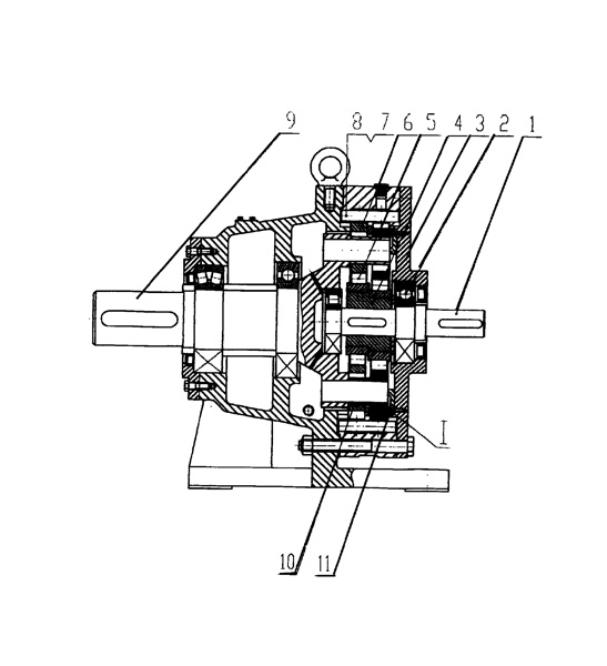 一種9000系列擺線針輪減速機,輸入軸(1)通過軸承(2)安裝在大端蓋(3)中,所述的輸入軸(1)經偏心套(4)及偏心套上的軸承(5)通過擺線輪(6)與針齒銷(7)上的針齒套(8)嚙合將動力傳遞給輸出軸(9)實現(xiàn)減速運動,其特征在于:所述輸出軸(9)上的銷軸套(10)與鑲嵌在大端蓋(3)上的減磨環(huán)(11)相接觸,使銷軸套(10)與大端蓋(3)隔開而減少大端蓋(3)承磨面(12)的磨損。