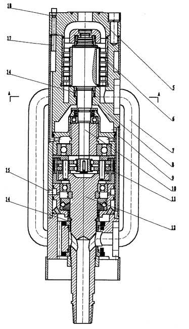| 一種旁流式水渦輪減速機,其上部外接高壓水系統(tǒng),殼體內(nèi)上部的高壓腔內(nèi)設(shè)置渦輪(6),殼體下部的低壓腔內(nèi)設(shè)置減速機構(gòu)(11),其特征是:設(shè)置高壓水導流管(7),導流管(7)上端連通在渦輪下部,下端連通輸出軸(12)的出水口。 |