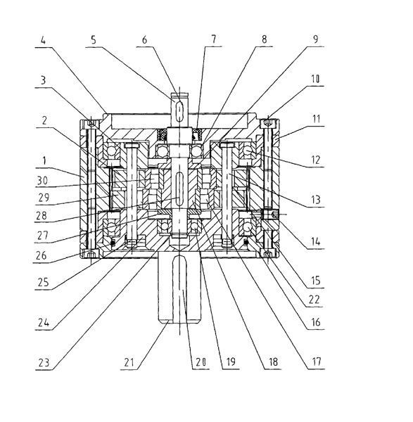 | 一種星輪減速機,包括輸入軸、輸出軸、齒輪、齒圈和通蓋,其特征是:減速機殼內(nèi)裝有輸入軸、輸出軸、齒輪、齒圈,輸入軸裝有偏心套(18),輸入軸(5)有雙支撐軸承(8、19),偏心套裝有兩偏心軸承(17、30),兩偏心軸承(17、30)分別裝有齒輪(2、29),兩齒輪(2、29)外聯(lián)接齒圈(1),兩齒輪(2、29)由連接銷軸(13)固定于均載盤(3)和軸出軸(21),均載盤(3)設(shè)有軸承(12),輸出軸(21)外圓與通蓋(16)間裝有密封圈。 |