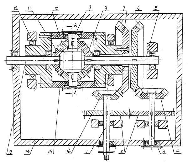 | 一種差動(dòng)齒輪減速機(jī),具有大箱體(14)和軸承(12),以及支承在大箱體(14)上的輸入軸(1)和輸出軸(13),其特征在于: a、輸入軸(1)上固定連接有第一主動(dòng)齒輪(16)和傳動(dòng)齒輪(2); b、大箱體(14)內(nèi)還支承有中間傳動(dòng)軸(3),該中間傳動(dòng)軸(3)上固定連接有第二主動(dòng)齒輪(4)以及與輸入軸(1)上的傳動(dòng)齒輪(2)相嚙合的傳動(dòng)齒輪(2); c、大箱體(14)內(nèi)還支承有速比差動(dòng)齒輪軸(5),該速比差動(dòng)齒輪軸(5)上固定連接有與第二主動(dòng)齒輪(4)相嚙合的速比差動(dòng)齒輪(6); d、大箱體(14)內(nèi)還具有可旋轉(zhuǎn)地支承在軸承(12)上的小箱體(15),小箱體(15)的一側(cè)固定連接有與第一主動(dòng)齒輪(16)嚙合的速比定齒輪(7),并支承有速比差動(dòng)齒輪軸(5),另一側(cè)支承有輸出軸(13),在小箱體(15)內(nèi),速比差動(dòng)齒輪軸(5)的軸端裝連有速比差動(dòng)齒輪軸齒輪(8),輸出軸(13)的軸端裝連有輸出齒輪(11); e、小箱體(15)內(nèi)還支承有二根或四根差動(dòng)齒輪軸(9),每根差動(dòng)齒輪軸(9)上都裝連有一只差動(dòng)齒輪(10),差動(dòng)齒輪(10)既與速比差動(dòng)齒輪軸齒輪(8)嚙合,又與輸出齒輪(11)嚙合; f、速比定齒輪(7)有Z1個(gè)齒,速比差動(dòng)齒輪(6)有Z2個(gè)齒,Z1和Z2相差1齒或數(shù)齒,第一主動(dòng)齒輪(16)有Z3個(gè)齒,第二主動(dòng)齒輪(4)有Z4個(gè)齒,Z3和Z4之比為1∶2。 |