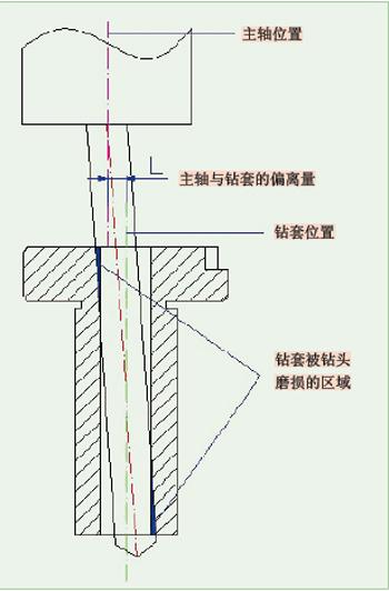 當鉆套位置與主軸位置的同軸度較差時,鉆頭刀具加工一段時間以后會導致鉆套進、出口處的相對位置的局部磨損。如圖4所示,由于鉆頭刀具與鉆套不同軸,所以鉆頭在進入鉆套時就碰到了左邊的孔壁,這樣導致鉆頭的直線度變化。而鉆頭在繼續(xù)進給時,由于鉆頭與鉆套的配合間隙,又造成鉆頭在鉆套的出口處碰到鉆套的右邊,這樣加工中不僅僅是加工孔的垂直度不好,使用時間一長還導致鉆套的進出口孔壁出現(xiàn)相對的孔壁位置磨損。這種現(xiàn)象開始的時候加工孔還在工藝允許要求范圍之內,但是時間一久,加工孔的位置度就會出現(xiàn)超差現(xiàn)象,因此,只能采用更換鉆套的方法來滿足加工孔的位置度要求。