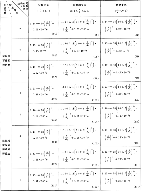齒輪第Ⅲ公差組精度為5~8級(硬齒面為5~6級)及相應(yīng)的結(jié)構(gòu)布局限制條件的KHβ簡化計算公式見表14或表15。