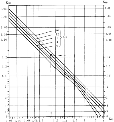 齒向載荷分布系數(shù)KFβ是考慮沿齒寬載荷分布對齒根彎曲應(yīng)力的影響。對于所有的實際應(yīng)用范圍,KFβ可按下式計算: