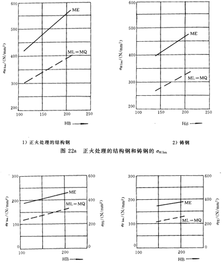 無資料時,可參考圖22~圖26根據(jù)材料和齒面硬度查取σHlim和σFlim值。